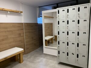 Τα αποδυτήρια, επίσης χωρισμένα σε αντρικό και γυναικείο χώρο, διαθέτουν ιδιωτικά ντουλαπάκια (lockers) με δυνατότητα κλειδώματος για την ασφαλή φύλαξη προσωπικών αντικειμένων. Και στα δύο αποδυτήρια υπάρχουν δύο ντους, πλήρως εξοπλισμένα με όλα τα απαραίτητα για μια αναζωογονητική εμπειρία καθαριότητας: σαμπουάν, αφρόλουτρο, μαλακτική κρέμα και μάσκα μαλλιών, ενώ στα γυναικεία αποδυτήρια διατίθεται επιπλέον και καθαριστικό σαπούνι ειδικά για την ευαίσθητη περιοχή.