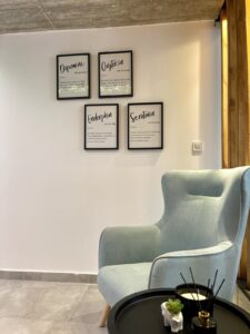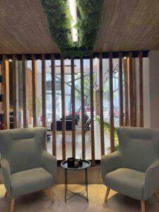Έξω από τα γραφεία υπάρχει επίσης ένας ειδικά διαμορφωμένος χώρος αναμονής, όπου οι επισκέπτες μπορούν να καθίσουν και να περιμένουν με ηρεμία πριν από το ραντεβού τους, απολαμβάνοντας την φιλόξενη ατμόσφαιρα του Trinity Pilates Hall.